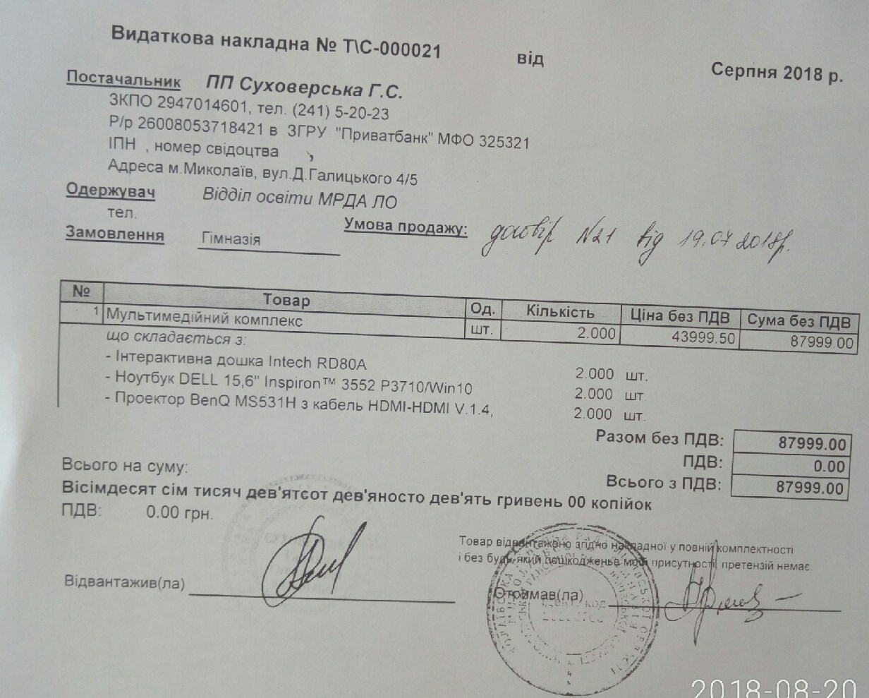12. Придбання мультимедійних комплексів (2 шт.) на суму 87 999 грн.